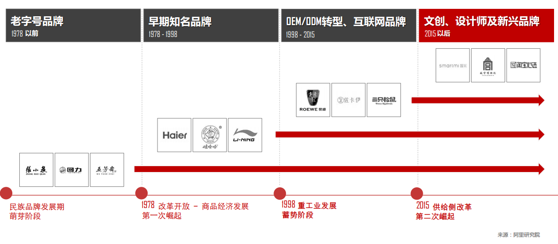 中国消费品牌历经百年发展,不同历史时期先后涌现出老字号品牌、早期知名品牌、代工企业转型品牌、互联网品牌、文创、科创及 新兴品牌。继“供给侧改革”提出后,国务院批准自2017年起,将每年5月10日设立为“中国品牌日”,不同类型品牌均面临转型升级, 中国消费品牌迎来发展新契机。数据显示,阿里巴巴零售平台消费品共计16个大类,2017年中国品牌市场占有率超过71%。线上高端市场 中国品牌表现突出,市场占有率同比上年提升3.6 个百分点,高端市场销售额三年复合增长率51.3%。