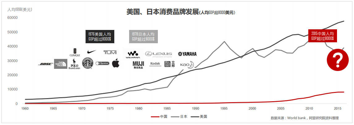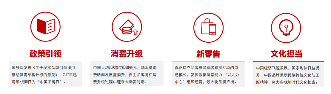 政策引领、消费升级、新零售、文化担当四大动力助推中国消费品牌发展。中国人均GDP已经超过8000美元,正处于从效率驱动向创新 驱动转变的过程之中,纵观美日消费品牌发展,中国自主品牌即将迎来大爆发时期。