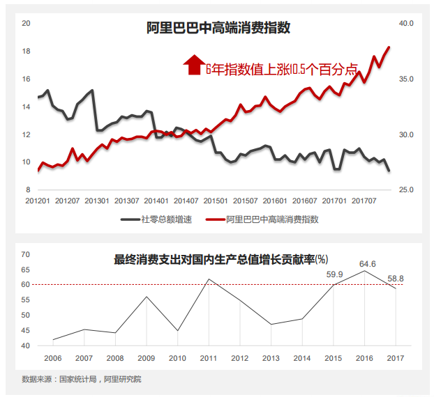 Aliresearch:X现象——消费由“量的增长” 转 变为“质的增长” , 5年阿里中高端消费指数值上 涨10.5个百分点。居民可支配收入持续增加,迅速 扩大的中产阶层群体驱动消费升级,在新生代与 女性群体购买力推动下,消费者对产品和服务提 出更高要求,表现为追求品质,讲究品牌,寻求 商品情感价值,呈现出个性化、多样化、高端 化、体验化的消费特点。