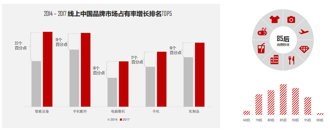 85后主流消费群体处于初建家庭和事业上升期,在各个生活消费品品类上均表现出对中国品牌的较强消费偏好,是推动 手机、3C数码、大家电品类中国品牌市场占有率上升的主要购买力。
