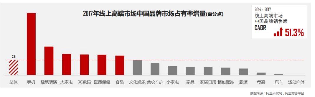 近年来,中国消费品牌线上高端市场*占有率逐年上升,手机、建筑装潢、大家电、3C数码、医药保健、食品类目增量领跑总体 均值,其中手机品类高端市场增速超出均值10个百分点以上。中国消费品牌品质商品吸引消费者关注,有效获得市场份额,提 品质初见成效。