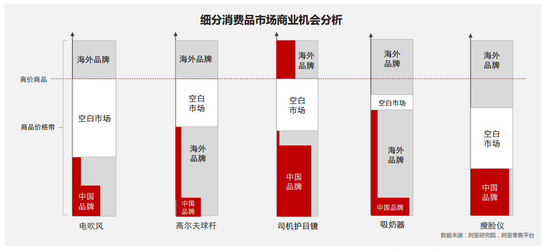 数据显示,电吹风、高尔夫球杆、司机护目镜、吸奶器、瘦脸仪等细分消费品市场,国际品牌与中国品牌价差 较大,中高端市场存在大量商业机会。