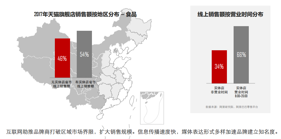 阿里巴巴全面助力中国消费品牌升级五大路径:品牌建设与营销创新、产品创新与品质提升、服务创新、渠道创新、数字化高效经营。 研究发现,品牌接入数字化统一市场可实现营业面积与营业时长上的拓展,线上消费市场46%的销售额来自没有实体店的区域, 34%来 自实体店非营业时间。